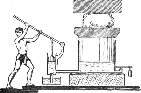 Работая достаточно долго, можно малой силой, приложенной к поршню насоса, произвести очень большое давление.