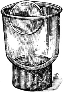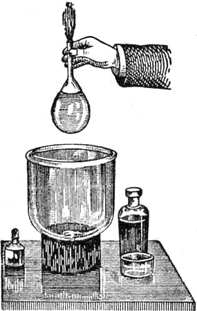Эфир образует очень тяжелый и легко воспламеняющийся пар. Этот пар может почти мгновенно проходить сквозь стенки пузыря. Правда, это выражение не вполне точно: в действительности пар сгущается на наружной стороне оболочки и снова испаряется на внутренней ее стороне. На пропускную бумагу, брошенную на дно стеклянного колокола, я наливаю немного эфира, и колокол вскоре заполняется тяжелым паром эфира. Вы можете убедиться, что в колоколе что-то есть, но не простым глазом, так как колокол кажется пустым, а при рассматривании его тени на экране. Я осторожно наклоняю сосуд, и вы видите, как что-то выливается из него. Это и есть пар эфира. Нетрудно убедиться, что он тяжел; достаточно выдуть пузырь и сбросить его в колокол: как только пузырь коснется пара, он перестанет падать и будет плавать по поверхности, подобно пробке на поверхности воды (рис. 50).