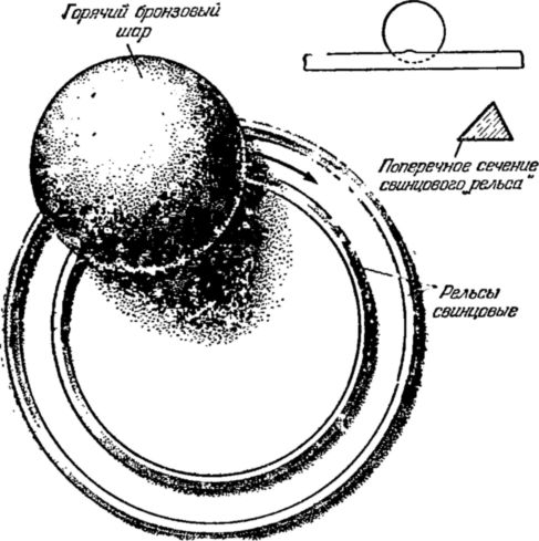 Кольца изготовляются из свинца, а шар из стали или бронзы. Перед демонстрацией шар возможно сильнее нагревают, но не выше температуры плавления свинца. Горячий шар, уложенный на свинцовые рельсы, нагревает их. Но свинец, как известно; обладает очень плохой теплопроводностью: она почти в 11 раз меньше, чем у меди. Поэтому в первый момент у рельсов расширяется лишь то место, к которому прикасается шар. От этого на рельсах возникают бугорки. Но шар удержаться на них не может и скатывается. Нагревается новое место.