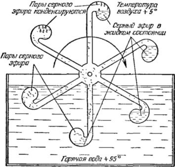 Наполним колбочки трёх стеклянных трубок какой-нибудь легкоиспаряющейся жидкостью, например серным эфиром, и запаяем их. Поместим это «колесо» в сосуд с горячей водой так, чтобы оно своей осью опиралось на стенки сосуда. Под действием веса серного эфира, находящегося в колбочках, «колесо» повернётся, и колбочки с ним погрузятся в горячую воду.