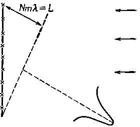 Пусть имеется решетка со множеством линий (фиг. 38.3), на которую направлен пучок частиц. Мы неоднократно рассматривали эту задачу: когда у частиц есть определенный импульс, то вследствие интерференции в некотором направлении возникает очень резкий максимум. Мы также говорили о том, насколько точно можно определить этот импульс, т. е. какова разрешающая сила решетки. Мы не будем заново это все выводить, а сошлемся на гл. 30; там мы выяснили, что относительная неопределенность в длине волны, связанная с данной решеткой, равна 1/Nm, где N — количество линий решетки, а m — порядок дифракционного максимума. Иначе говоря,