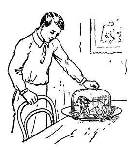 Зажигаю на тарелке кучку серного цвета, увлажняю слегка своего "льва" водою, взбрызнув его для "бодрости" из пульверизатора, сажаю на тарелку и прикрываю колпаком (рис. 38); можно взять, как я указал раньше, большую закупоренную бутылку с отрезанным дном. Лев "не выносит" удушливого запаха горящей серы и вскоре становится совершенно зеленым.