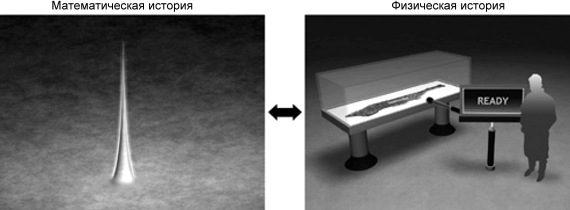 Важно понять, что физикам всегда приходится рассказывать истории с двух сторон. Одна сторона история — математическая — о том, как вселенная развивается согласно данной теории. Другая история — физическая, которая переводит абстрактные математические термины на экспериментальный язык. Вторая история описывает то, как математическая эволюция видится таким наблюдателям, как мы с вами, и, в более общем смысле, что математические символы теории говорят нам о природе реальности.{73} Во времена Ньютона эти две истории в общем и целом были идентичны, как я отмечал в главе 7, когда говорил о непосредственности и осязаемости ньютоновской «архитектуры». Каждый математический символ в уравнениях Ньютона имеет прямой и очевидный физический аналог. Символ x? О, это положение мяча. Символ ?? Скорость мяча. Однако когда мы переходим к квантовой механике, перевод математических символов в наблюдаемые явления окружающего нас мира оказывается не столь простым. Более того, используемый язык и понятия, необходимые для двух историй, становятся столь отличными, что вам требуется хорошо разобраться с каждой. Однако важно разделять, что есть что: какие идеи и описания привлекаются как часть фундаментальной математической структуры теории, а какие используются для установления связи с человеческим опытом.