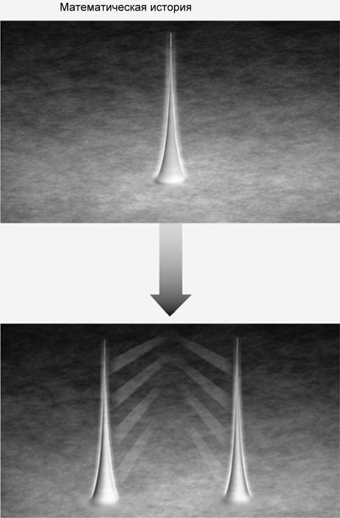 Теперь воспользуемся линейностью и соединим два результата воедино. При измерении положения электрона, волна вероятности которого имеет два пика, волна вероятности частиц, из которых состоите вы и детектор, смешивается с волной электрона, что приводит к эволюции, показанной на рис. 8.16а — объединённой эволюции, изображённой на рис. 8.14а и 8.15а. Пока что это не более чем иллюстрированная и прокомментированная версия квантовой истории первого типа. Мы стартуем от волны вероятности с заданной формой, далее она эволюционирует во времени как предписывает уравнение Шрёдингера, и в результате возникает волна вероятности с новой формой. Давайте, опуская подробности, изложим эту математическую историю не количественным, а качественным языком истории второго типа.