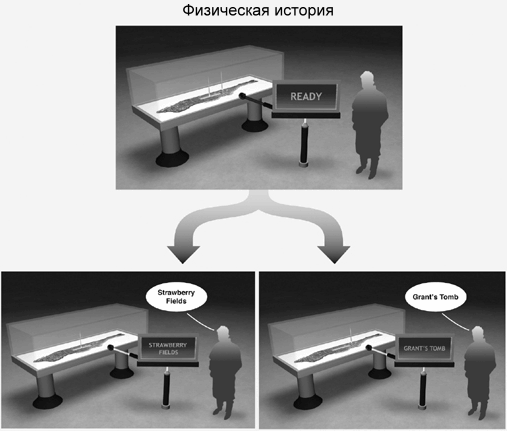 На самом деле, фокусировка на детекторе и на вашем сознании является ещё одним упрощением. Можно было бы добавить частицы, из которых состоит лаборатория и всё, что в ней находится, а также частицы, из которых состоит Земля, Солнце и всё остальное, и все рассуждения остались бы прежними, буквально дословными. Единственное различие в том, что светящийся профиль волны вероятности на рис. 8.16а теперь будет также содержать информацию о всех таких частицах. Но поскольку обсуждаемое нами измерение не оказывает на самом деле на них влияния, их роль совершенно вторична. Однако будет полезно учесть эти частицы, потому что нашу историю второго типа можно расширить и включить не только вашу копию, колдующую над детектором, который проводит измерение, но также копии вашей лаборатории, всего остального на Земле, вращающейся по орбите вокруг Солнца, и так далее. Это означает, что каждый пик в истории второго типа соответствует тому, что мы традиционно назвали бы настоящей вселенной. В одной такой вселенной на мониторе детектора вы видите «Земляничные поля», в другой — «Мемориал Гранта».