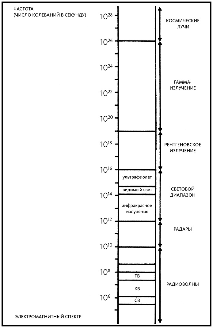 Это открытие в корне изменило наше представление о физическом мире. В ньютоновской модели силы непосредственно связаны с телами, на которые они воздействуют. Теперь же место понятия «силы» заняло более сложное понятие «поля», которое существует само по себе и не имеет отношения к материальным телам. Кульминацией этой теории, получившей название электродинамики, было понимание того, что сам свет — переменное электромагнитное поле высокой частоты, движущееся в пространстве в виде волн. Мы теперь знаем, что и радиоволны, и волны видимого света, и рентгеновские лучи — электромагнитные волны, колеблющиеся магнитное и электрическое поля, различающиеся только частотой колебаний, а видимый свет — незначительная часть электромагнитного спектра (рис. 3).