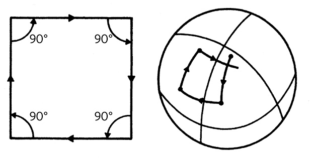 Согласно теории Эйнштейна, гравитация способна «искривлять» время и пространство. В искривленном пространстве законы евклидовой геометрии не действуют, так же как двумерная евклидова геометрия не может быть применена на поверхности сферы. На плоскости, например, мы можем нарисовать квадрат так: отложить метр на прямой линии, отложить прямой угол и снова отмерить метр, затем отложить еще один прямой угол и снова отмерить метр, в третий раз отложить прямой угол и, вернувшись в исходную точку, получить квадрат. А на поверхности шара эти правила не действуют (рис. 4). Теория Эйнштейна утверждает, что трехмерное пространство искривляется под воздействием гравитационного поля тел с большой массой.
