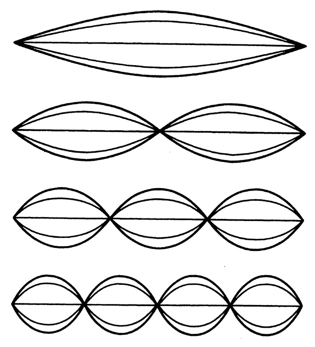 На орбитах эти электронные волны формируют замкнутые паттерны «стоячих волн». Они возникают всегда, когда волны ограничены в некотором пространстве, как, например, упругие колебания гитарной струны или воздушные колебания внутри флейты (рис. 6).