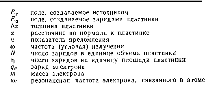 Мы должны теперь выяснить, имеет ли поле осциллирующих зарядов в пластинке тот же вид, что и поле Еа во втором члене (31.8). Если это так, то тем самым мы найдем и показатель преломления n [поскольку n — единственный фактор в (31.8), не выражающийся через фундаментальные величины]. Вернемся теперь к вычислению поля Еа, создаваемого зарядами пластинки. (Для удобства мы выписали в табл. 31.1 обозначения, которыми мы уже пользовались, и те, которые нам понадобятся в дальнейшем.)