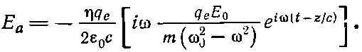 Как и следовало ожидать, вынужденное колебание электронов привело к новой волне, распространяющейся вправо (на это указывает множитель ехр[i?(t-z/c)]); амплитуда волны пропорциональна числу атомов на единице площади пластинки (множитель ?), а также амплитуде поля источника (Е0). Кроме того, возникают и другие величины, зависящие от свойств атомов (qe, m, ?0).