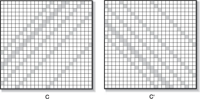 Рис. 7.5. В шахматном мире C присутствуют только диагональные линии серых квадратиков, идущие из левого нижнего угла в правый верхний. Если изменить направление времени на противоположное, то мы получим картинку C', на которой нет ничего, кроме диагональных линий из правого нижнего угла в левый верхний. Строго говоря, шахматная доска C не инвариантна относительно изменения направления времени — она инвариантна относительно одновременного отражения в пространстве и во времени