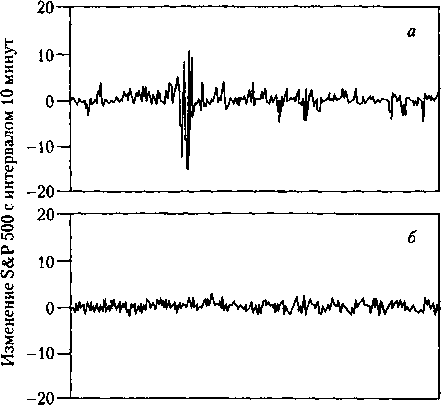 Рис. 8.2: а) колебания индекса цен S&P 500 (Standard & Poor 500 market index), одного из основных показателей состояния экономики США. Величина изменений в данном случае соответствует разнице цен, возникающей на бирже за интервал времени 10 минут. Т. е. нулевое значение означает, что индекс не изменился за последние 10 минут; 6) на нижнем рисунке представлена модельная картина чисто гауссовских флуктуаций, значительно отличающихся от реального изменения курса стоимости товаров и акций.