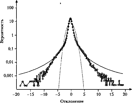 Еще один вариант выявления разницы наблюдаемых закономерностей с классической статистикой состоит в построении графика зависимости вероятности отклонений от их величины (рис. 8.3.). Легко заметить, что даже при небольших отклонениях реальные данные плохо соответствуют гауссовскому распределению. Еще более отчетливо различия проявляются при больших отклонениях от среднего, которые гауссовское распределение рассматривает как крайне маловероятные. В гауссовской модели Башелье большие флуктуации в цене, соответствующие биржевому краху или неожиданному буму, представлялись невозможными в принципе, а рынок должен был колебаться вокруг более или менее устойчивого состояния. Но крахи тем не менее случаются.