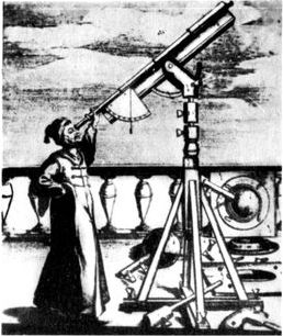 Ученый наблюдает небо с помощью примитивного телескопа.