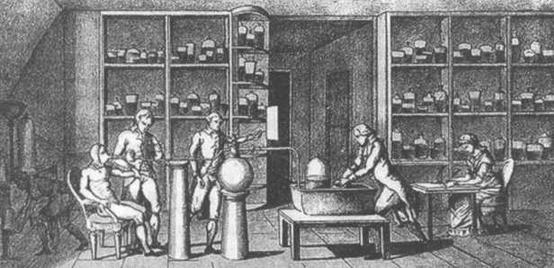 Гравюра XVIII века, изображающая Мари Анн Пьеретту Польз (справа), помогающую своему мужу Лавуазье (перед ней) во время научного опыта, посвященного человеческому дыханию.