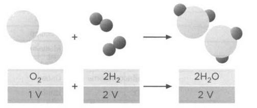 Согласно закону объемных отношений Гей-Люссака один объем (1V) кислорода при соединении с двумя объемами (2V) водорода образует два объема (2 V) воды, то есть вещества, вступающие в реакцию, и вещество, образовавшееся в ее результате, относятся друг к другу как простые числа (1:2:2). Версия Ампера была следующей: частица кислорода — двухатомная молекула в современной терминологии — соединяется с двумя частицами водорода — двумя молекулами в современном смысле, — в результате чего образуется две молекулы воды — две молекулы, состоящие из двух атомов водорода и одного атома кислорода.