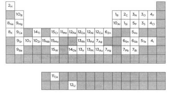 Эта таблица включает 48 элементов, известных во времена Ампера, остальные были вскоре открыты. На рисунке указан номер вида, присвоенный элементу Ампером, чтобы было видно, где он оказался прав и где ошибся.