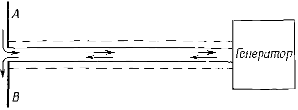 Суть дела в том, что генератор создает разность потенциалов или поле, которое в один момент времени выталкивает электроны из участка А и втягивает их в участок В, а через ничтожно малый промежуток времени действие поля становится обратным и электроны из В перекачиваются обратно в А! Так что в этих двух проволочках заряды на участках А и В как бы ускоряются одновременно то вверх, то вниз. Две проволоки и генератор нужны только в этом устройстве. Окончательный же результат таков, что заряды ускоряются вверх и вниз так, как если бы А и В составляли один кусок проволоки. Отрезок проволоки, длина которого очень мала по сравнению с расстоянием, проходимым светом за один период колебаний, называется электрическим дипольным осциллятором.