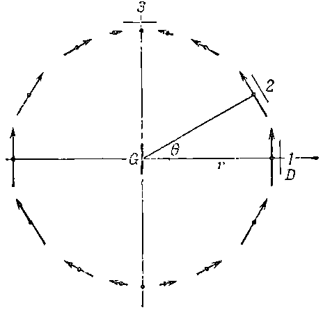 Фиг. 28.2. Измерение электрического поля в точках окружности, центр которой совпадает с положением линейного осциллятора.