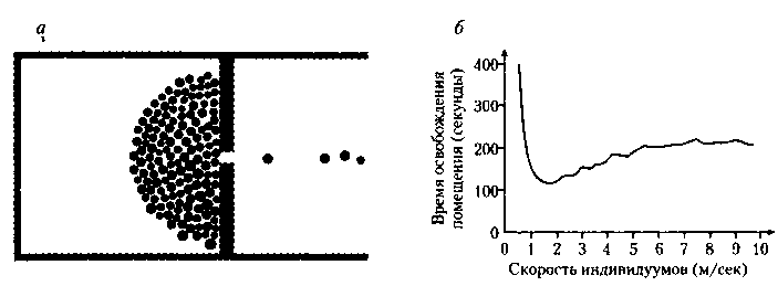 Рис. 6.10. (а) Моделирование процессов бегства толпы из заполненного помещ< ния. При очень высокой скорости движения все люди немедленно скапливаются единственной двери, устраивая давку и мешая друг другу покинуть помещение, чт соответствует паническому состоянию толпы, (6) Время, необходимое для эвакуаци людей из помещения, при повышении скорости передвижения отдельных инд* видов сперва уменьшается, но затем, после превышения некоторого критическоі значения скорости, начинает возрастать, сигнализируя о наступлении паническоі состояния, когда люди начинают мешать друг другу. С методами и результатам моделирования можно ознакомиться на сайте «Pedestrian simulations» по адрес angel.elte.hu/-panic/.