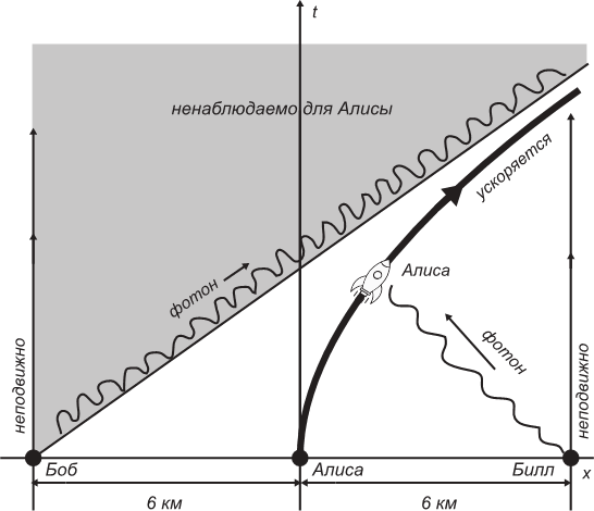Ускорение Алисы как раз такое, чтобы она никогда не увидела фотонов, которые отправляет в ее сторону Боб в момент t = 0. Однако она получает фотоны, которые в момент t = 0 ей послал Билл. В результате получается, что Алиса способна наблюдать только одну половину пространства-времени.