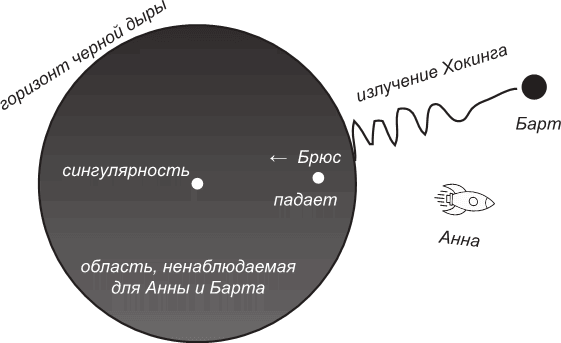 Рис. 7.2. Схема возникновения излучения Хокинга. Анну, остающуюся на фиксированном радиусе у горизонта, можно считать ускоряющимся наблюдателем, так как она испытывает гравитационное притяжение черной дыры. Она видит излучение по тем же причинам, по которым возникает эффект Унру. Это излучение на своем пути наружу к Барту подвергается гравитационному красному смещению. Барт, так же как и Анна, находится в стационарном состоянии, но он настолько далеко от черной дыры, что едва ли чувствует ее притяжение. Падающий в черную дыру извне наблюдатель Брюс при пересечении горизонта не видит излучения Хокинга.