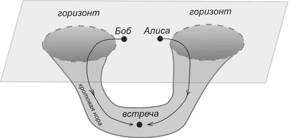 Рис. 7.3. Кротовая нора, соединяющая области пространства-времени вблизи Алисы и Боба соответственно. Кротовые норы, возникающие из запутанных квантовых состояний, позволяют Алисе и Бобу встретиться друг с другом, прыгая в черные дыры. Затем они еще могут успеть сверить свои квантовые запутанности, прежде чем их ждет роковое поглощение сингулярностью черной дыры.