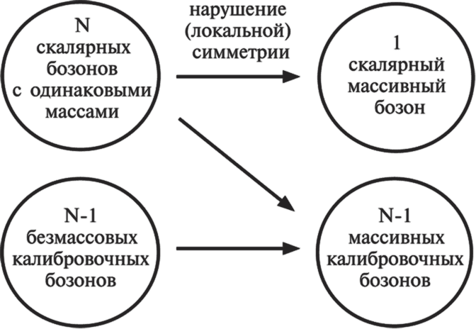 Вот что случается при спонтанном нарушении локальной (калибровочной) симметрии, и это кардинально отличается от разобранного ранее случая нарушения глобальной симметрии. Теперь в симметричной ситуации есть безмассовые калибровочные бозоны и массивные скалярные бозоны. Те бозоны, которые были бы безмассовыми при нарушении глобальной симметрии, съедаются калибровочными бозонами, которые становятся массивными. Остается один массивный скалярный бозон – это бозон Хиггса.