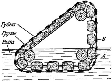 Английский артиллерист и инженер Вильям Конгрев, живший в 1772–1828 гг., сконструировал вечный двигатель, состоящий из трёхгранной призмы с роликами Г, В, Д на углах и ленты с губками, натянутой вокруг призмы (рис. 11).