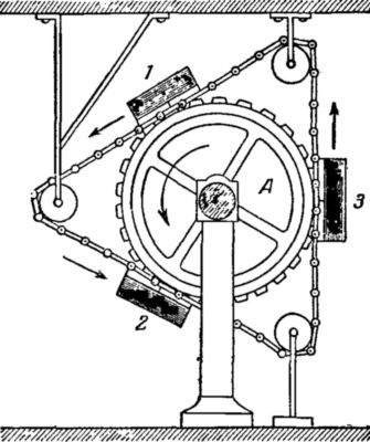 Рис. 11. Поплавково-цепной вечный двигатель Вильяма Конгрева (XVIII–XIX века).
