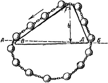 Для решения задачи о равновесии тел на наклонной плоскости Стевин мысленно отрезал всю нижнюю часть цепи по линии АБ (рис. 13). Изобретатель вечного двигателя утверждал бы в этом случае, что четыре шара, лежащих на плоскости ВГ, перетянут три шара, находящихся на плоскости ГД, скатываясь вниз к точке В. Следовательно, и вся цепь, соединённая в кольцо, также будет перемещаться беспрерывно.