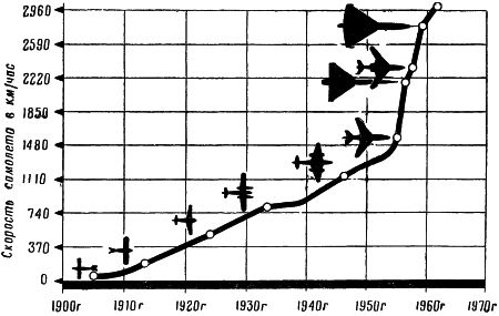 В удивительном прогрессе авиации с момента ее зарождения и до наших дней, наряду с колоссальным ростом грузоподъемности самолетов, высоты и дальности полета, особенно выделяются успехи в штурме скоростей. Взгляните на график (рис. 6). На нем показано, как из года в год росли абсолютные рекорды скорости полета самолетов. Из графика видно, что с 1906 по 1962 год скорость увеличилась примерно от 50 до 3 тыс. км/час, т. е. в 60 раз! Какими путями был достигнут такой гигантский скачок скоростей? Конечно, прежде всего увеличением мощности авиационных двигателей, и главный прирост в рекордах скоростей произошел с внедрением в авиацию реактивных двигателей. Да и материалы, из которых делают самолеты, стали более прочными.