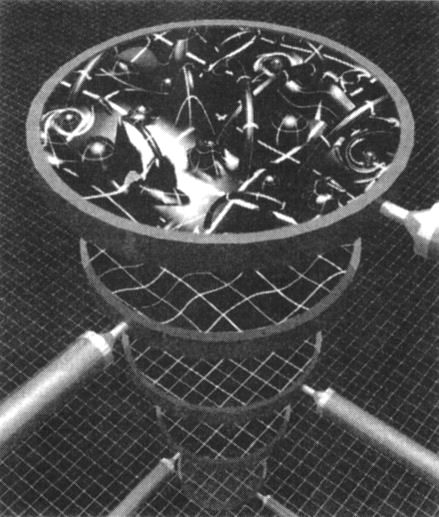 Рис. 12.2. Последовательное усиление увеличения при исследовании пространства обнаруживает, что при масштабах ниже планковской длины пространство становится неузнаваемо бурным и запутанным вследствие квантовых флуктуаций (здесь представлены воображаемые увеличительные стёкла, каждое из которых даёт увеличение где-то между 10 и 100 млн раз)