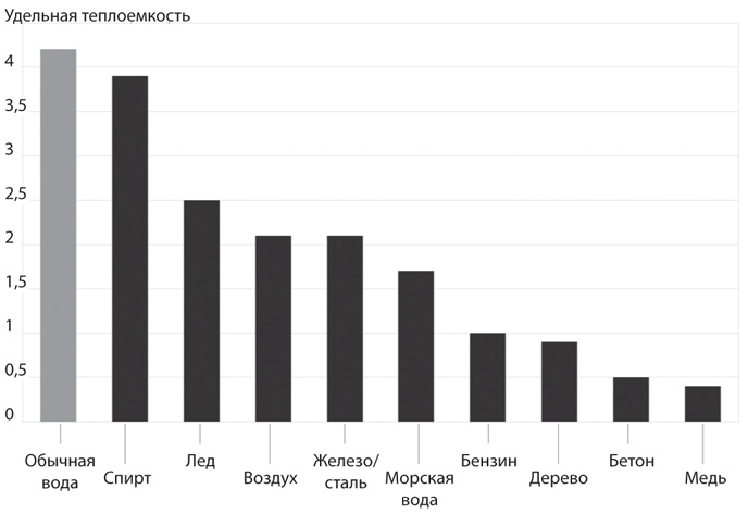 Когда вы раздеваетесь в старой холодной ванной, то хотите сразу согреться в горячей воде. Как мы видели в главе 2, вода обладает большой теплоемкостью. Чтобы нагреть литр воды на один градус, нужно больше энергии (примерно 4200 Дж), чем для нагревания на ту же температуру любого другого вещества. Причина в том, что молекулы воды состоят из очень легких атомов (атомы водорода вообще самые легкие, а атомы кислорода занимают в периодической таблице восьмое место), поэтому в воде больше молекул, чем в любом другом веществе. Каждая из них может поглотить определенное количество энергии, начав активные вибрации и движения. Так что большую теплоемкость воде придает именно огромное количество молекул.