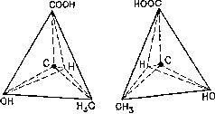 Рис. 11. Тетраэдрическое расположение связей атомов углерода допускает две конфигурации, одна из которых является зеркальным отображением другой. На рисунке показаны два возможных варианта расположения атомов в молекуле молочной кислоты.