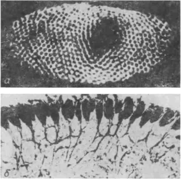 Фиг. 36.11. Сложный глаз краба-мечехвоста, а — общий вид; б — в разрезе.