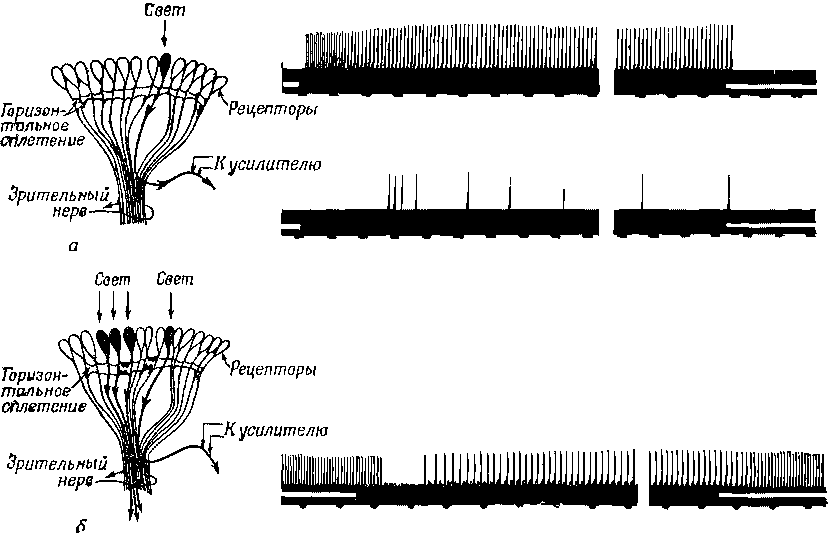 Проделаем теперь другой опыт: осветим первый омматидий и получим те же импульсы, но если теперь мы направим свет еще на другой соседний омматидий, то на короткое время импульсы прекращаются, после чего импульсы «побегут» снова, но с гораздо меньшей частотой (фиг. 36.12,б). Оказывается, что импульсы, возникающие во втором омматидий, затормаживают импульсы первого! Другими словами, хотя каждый нерв и несет информацию о своем омматидий, количество этой информации подавляется сигналами от другого омматидия. Например, когда более или менее равномерно освещен весь глаз, то сигнал, пришедший от любого отдельного омматидия, будет относительно слабым, ибо он подавлен множеством других сигналов. Торможение аддитивно, т. е. если мы осветим несколько соседних омматидиев, торможение будет очень сильным.