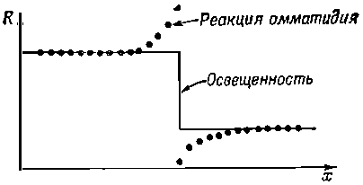 Фиг. 36.13. Ответная реакция омматидия краба-мечехвоста на резкий освещенный край.