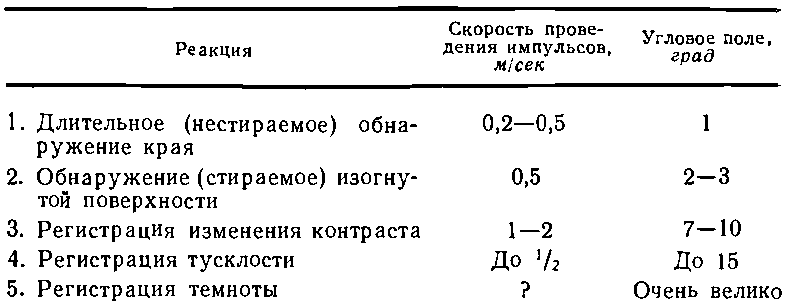 Таблица 36.1 ТИПЫ ОТВЕТНЫХ РЕАКЦИЙ ЗРИТЕЛЬНЫХ НЕРВНЫХ ВОЛОКОН У ЛЯГУШКИ