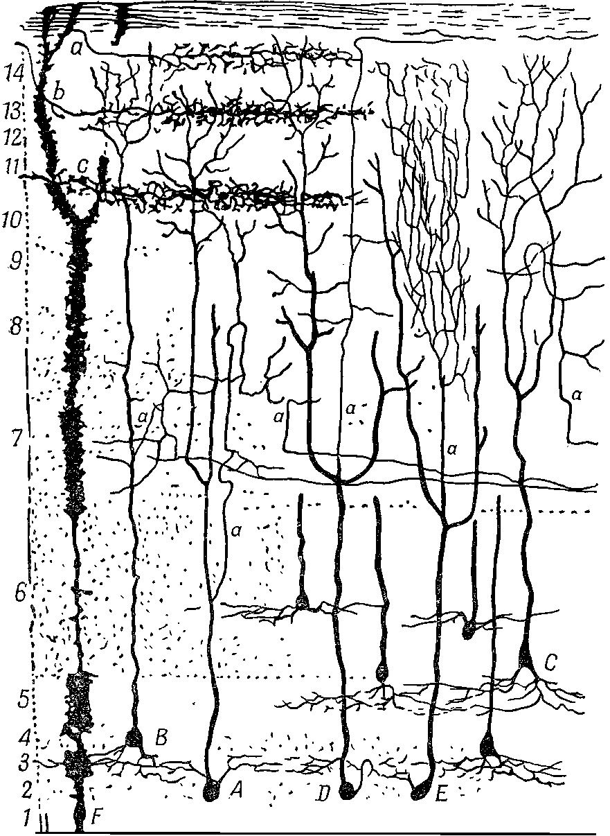 На фиг. 36.14 показана поверхность так называемой покрышки мозга лягушки. Сюда приходят волокна из зрительного нерва. Все эти нервные волокна связаны с различными слоями покрышки. Слоистое строение ее напоминает строение сетчатки (это один из фактов, говорящих нам о том, что сетчатка и мозг весьма похожи друг на друга). Если теперь взять электрод и постепенно перемещать его вниз по слоям, то можно определить, где оканчиваются разные типы зрительных волокон. Опыт дает очень красивый и удивительный результат: оказывается, что различные сорта волокон оканчиваются в различных слоях! В первом слое оканчивается первый тип волокон, во втором — второй; третий и пятый оканчиваются в одном и том же слое, а глубже всех проникает четвертый тип. (Вас не должно удивлять, что номера их почти совпали с номерами слоев! Именно поэтому они и пронумерованы таким образом, в ранних работах они нумеровались иначе!)