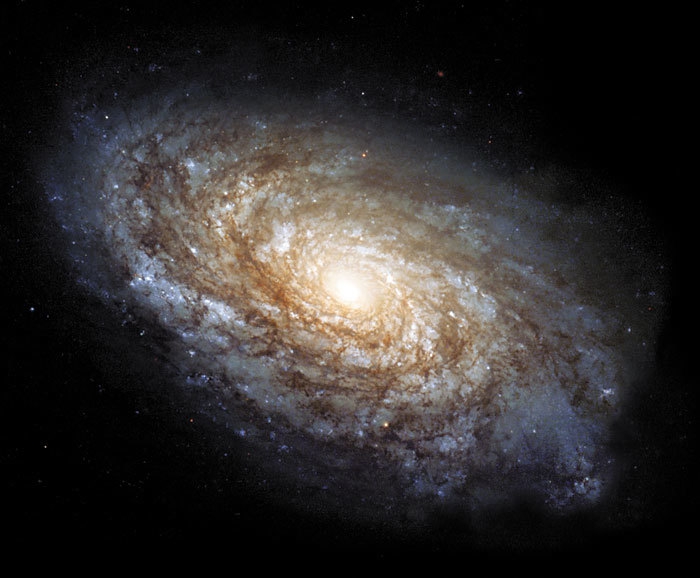 Это изображение величественной спиральной галактики NGC 4414 было получено на космическом телескопе «Хаббл» в 1995 г. Тщательно измерив блеск переменных звезд в этой галактике, астрономы смогли с высокой точностью определить расстояние до нее. Полученное расстояние (около 60 млн световых лет), а также определенные аналогичным способом расстояния до других ближайших галактик помогают астрономам больше узнать о скорости расширения Вселенной. В 1999 г. участники Комитета по наследию телескопа «Хаббл» повторно изучили снимки NGC 4414 и создали потрясающее полноцветное изображение этой пылевой спиральной галактики. На этом новом изображении видно, что центральные области этой галактики населяют в основном более старые желтые и красные звезды, что типично для большинства спиральных галактик. Внешние спиральные рукава — значительно голубее из-за продолжающегося формирования молодых голубых звезд, самые яркие из которых можно рассмотреть индивидуально благодаря высокому разрешению камеры телескопа «Хаббл».
