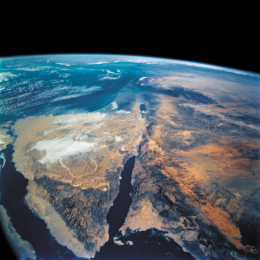 Эта фотография поверхности Земли в районе Синайского полуострова и Мертвого моря была сделана астронавтами с борта многоразового космического корабля «Колумбия» на 70-миллиметровую пленку. В квантовой теории гравитации пространство-время похоже на поверхность Земли — оно конечно по протяженности, но не имеет границы или края.