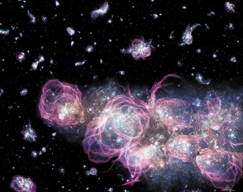 Со временем газ в этих галактиках распадается на облака, сжимающиеся под действием собственной гравитации. По мере сжатия температура газа увеличивается, пока он не нагревается настолько, что запускаются ядерные реакции. Водород превращается в гелий, а выделяющееся при этом тепло приводит к увеличению давления, что останавливает дальнейшее сжатие облаков. Они могут оставаться в таком состоянии долгое время, подобно нашему Солнцу, сжигая водород и превращая его в гелий и излучая энергию в виде тепла и света.