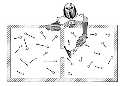 Джеймс Клерк Максвелл, живший в XIX веке, придумал замечательный мысленный эксперимент, при помощи которого можно было бы найти лазейку во Втором законе термодинамики. Максвелл представил себе емкость, наполненную молекулами газа, и быстрыми, и медленными, основательно перемешанными, так что достигнуто состояние высокой энтропии. В середине емкости есть перегородка, отделяющая левую половину от правой, а в перегородке — малюсенькая дверца. Каждый раз, когда с левой стороны коробки к дверце приближается холодная молекула (то есть молекула, которая движется со скоростью меньше средней), очень умный демон открывает дверцу и пропускает молекулу в правую сторону емкости. Точно так же, когда справа приближается горячая молекула, демон открывает дверцу и пропускает молекулу в левую сторону емкости. В остальное время дверца закрыта.