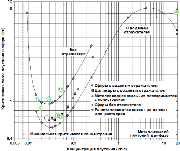 Рисунок 39. Критические массы гомогенных плутониевых сфер с водяным замедлителем. Точки между кривыми относятся к раствору Pu(NO3)4 с избыточным содержанием HNO3 с концентрацией 1 моль/л и содержанием 240Pu, равным 3,1 %, в системе с водяным отражателем. Аварии показаны кружками с номерами.