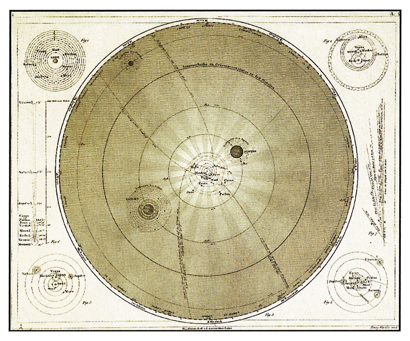 Старинный рисунок, на котором изображены разные космологические модели, объяснявшие движение планет. На центральной схеме представлена гелиоцентрическая (в центре находится Солнце) модель движения шести известных в то время планет, их спутников и других небесных тел, обращающихся вокруг Солнца. Со второго века доминирующей моделью стала геоцентрическая (в центре находится Земля) система Птолемея (вверху слева). На смену ей пришла гелиоцентрическая система Коперника, опубликованная в 1543 г. (внизу справа). В египетской модели (внизу слева) и модели Тихо Браге (вверху справа) предпринимались попытки сохранить представление о неподвижной Земле как центре Вселенной. Подробные сведения об орбитах планет приведены слева и справа.