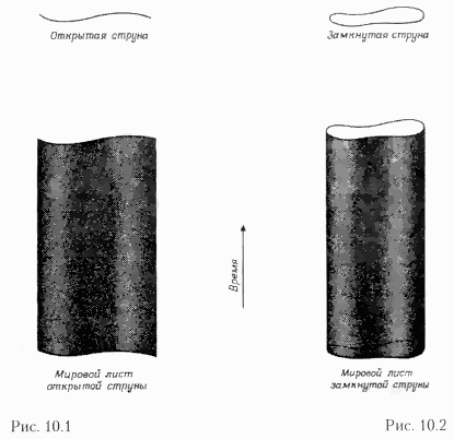 Несмотря на все эти проблемы и на то, что частицы в теориях супергравитации, по-видимому, отличались от наблюдаемых частиц, большинство ученых считало, что супергравитация может привести к правильному решению задачи об объединении физики. Но в 1984 г. общее ученое мнение сильнейшим образом изменилось в сторону так называемых струнных теорий. Основными объектами струнных теорий выступают не частицы, занимающие всего лишь точку в пространстве, а некие структуры вроде бесконечно тонких кусочков струны, не имеющих никаких измерений, кроме длины. Концы этих струн могут быть либо свободны (так называемые открытые струны), либо соединены друг с другом (замкнутые струны) (рис. 10.1 и 10.2). Частица в каждый момент времени представляется одной точкой в пространстве. Следовательно, ее историю можно изобразить линией в пространстве-времени (мировая линия). Но струне в каждый момент времени отвечает линия в трехмерном пространстве. Следовательно, ее история в пространстве-времени изображается двумерной поверхностью, которая называется «мировым листом». (Любую точку на таком мировом листе можно задать двумя числами, одно из которых — время, а другое — положение точки на струне). Мировой лист открытой струны представляет собой полосу, края которой отвечают путям концов струны в пространстве-времени (рис. 10.1). Мировой лист замкнутой струны — это цилиндр или трубка (рис. 10.2), сечением которой является окружность, отвечающая положению струны в определенный момент времени.