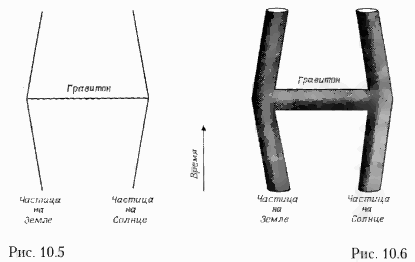 Два куска струны могут соединиться в одну струну; в случае открытых струн они просто смыкаются концами (рис. 10.3), а соединение замкнутых струн напоминает соединение двух штанин в брюках (рис. 10.4). Аналогичным образом кусок струны может разорваться на две струны. То, что раньше считалось частицами, в струнных теориях изображается в виде волн, бегущих по струне так же, как бегут волны по натянутой веревке, если ее дернуть за конец. Испускание и поглощение одной частицы другой отвечает соединению и разделению струн. Например, гравитационная сила, с которой Солнце действует на Землю, в теориях частиц изображалась как результат испускания какой-нибудь частицей на Солнце гравитона и последующего его поглощения какой-нибудь частицей на Земле (рис. 10.5). В теории струн этот процесс изображается Н-образным соединением трубок (рис. 10.6). (Теория струн в каком-то смысле подобна технике водопроводчика). Две вертикальные стороны соответствуют частицам, находящимся на Солнце и на Земле, а горизонтальная поперечина отвечает летящему между ними гравитону.