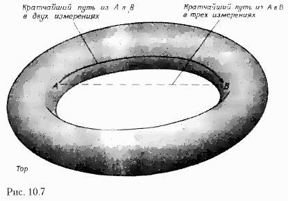 В теориях струн тоже возникают бесконечности, но есть надежда, что в тех или иных теориях гетеротической струны эти бесконечности сократятся (хотя пока это еще не известно). Но струнные теории содержат значительно более серьезную трудность: они непротиворечивы, по-видимому, лишь в десяти или двадцатишестимерном пространстве-времени, а не в обычном четырехмерном! Лишние измерения — это обычное дело в научной фантастике; там без них и в самом деле почти невозможно обойтись, потому что иначе, из-за того что, согласно теории относительности, нельзя двигаться быстрее света, путешествия среди звезд и галактик происходили бы немыслимо долго. Идея научной фантастики заключается в том, что можно както сократить путь, пройдя через лишнее измерение. Эту мысль можно следующим образом пояснить на рисунке. Представьте себе, что пространство, в котором мы живем, имеет только два измерения и искривлено, как поверхность бублика, или тора (рис. 10.7). Если вы находитесь в какой-то точке на внутренней стороне тора и хотите попасть в противоположную точку, вам придется обойти тор по внутреннему кольцу. А если бы вы умели перемещаться в третьем измерении, вы могли бы срезать, пойдя напрямик.