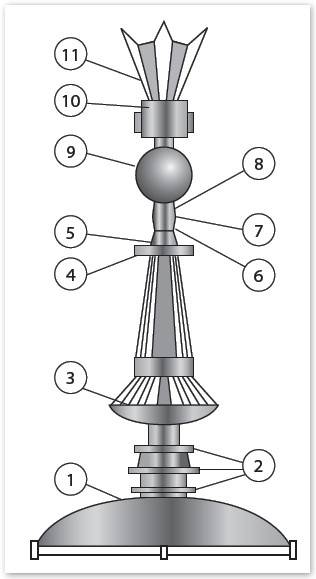 1 – отражатель фотонов излучения, возникающего при аннигиляции материи и антиматерии; 2, 4 – защитные экраны; 3 – баки с горючим (антиматерией, подвешенной в магнитном поле); 5 – оранжерея; 6 – производственные помещения; 7 – кают-компания; 8 – специальные и жилые каюты; 9 – обсерватория, научный центр; 10 – космоботы; 11 – ракетопланпланетолет